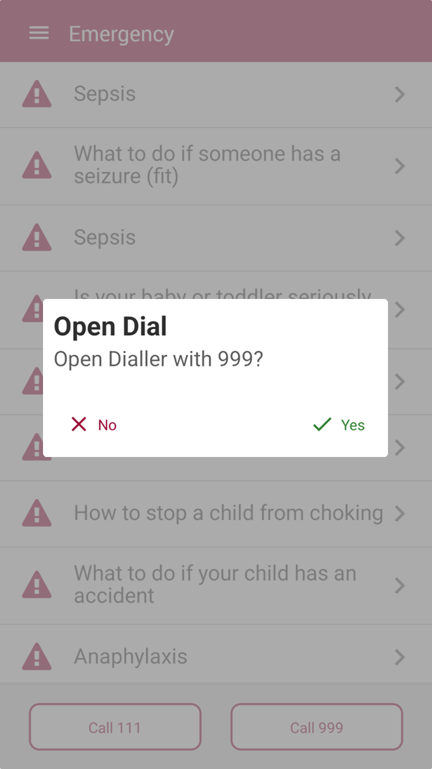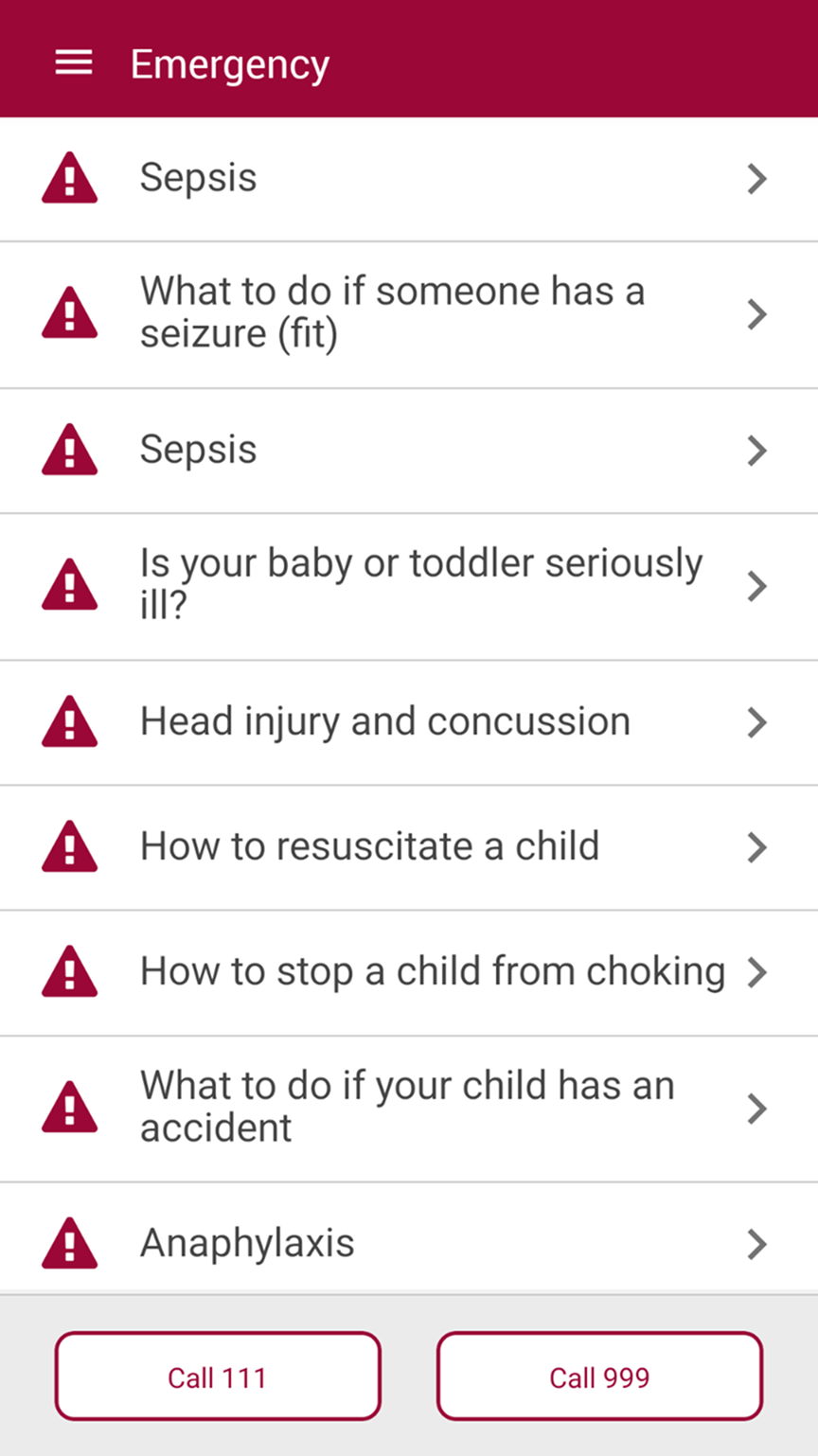In an emergency, always call 999. 'Call 999' and 'Call 111' buttons are included for quick access.